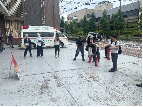 9月13日(土)に、日本語教室に通われている外国人向けに119番通報訓練を実施しました。当日は約15名の方にご参加いただき、3つのグループに分かれ、119番通報訓練のほか消火器取扱訓練や車両見学を体験されました。