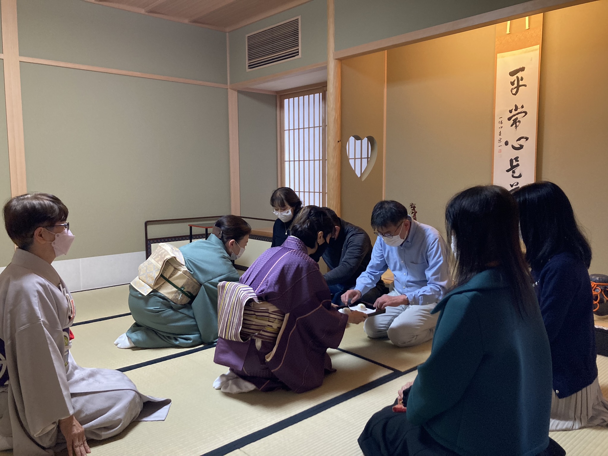 躙口(にじりくち)から小間に入り掛け軸を拝見、広間にてお点前を見、お菓子のいただき方やタイミング、お抹茶のいただき方や作法などを体験されました。お茶室に入ると背筋が伸びるような空気の中、お作法に四苦八苦される様子も見られましたが、とても和やかな雰囲気で執り行われました。